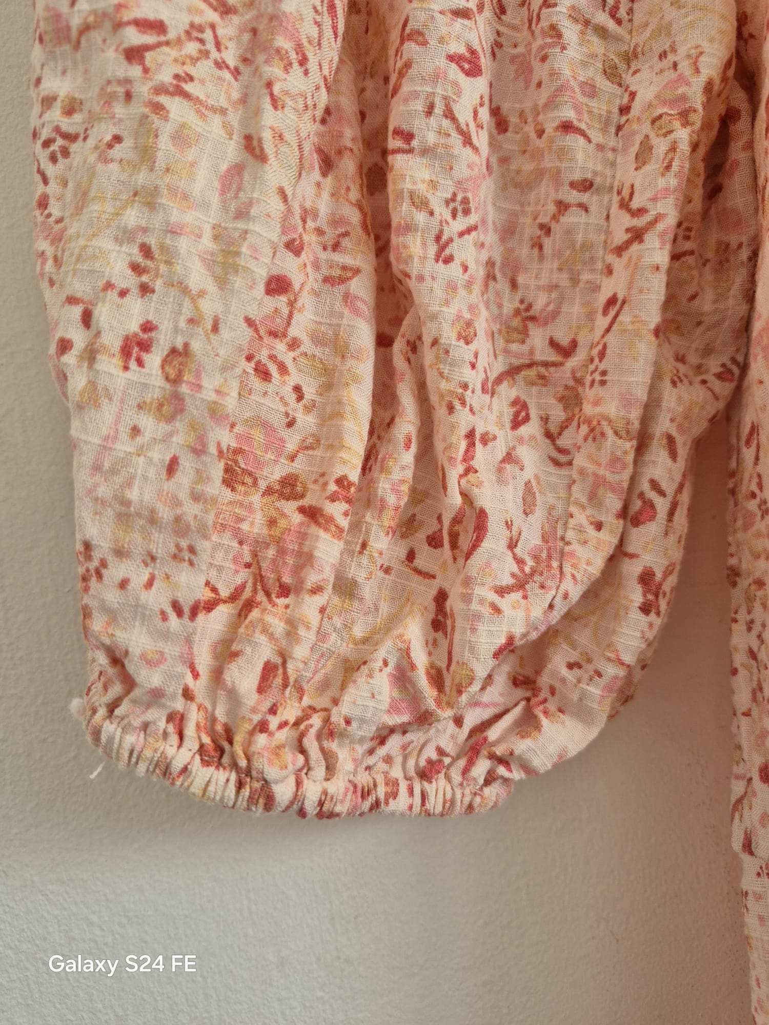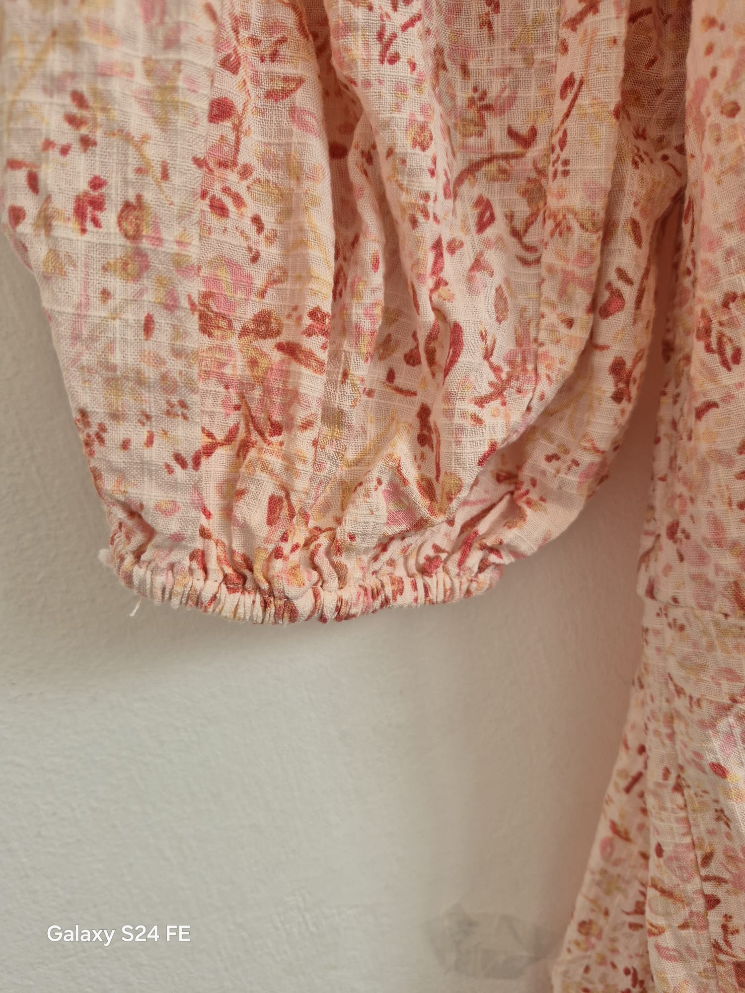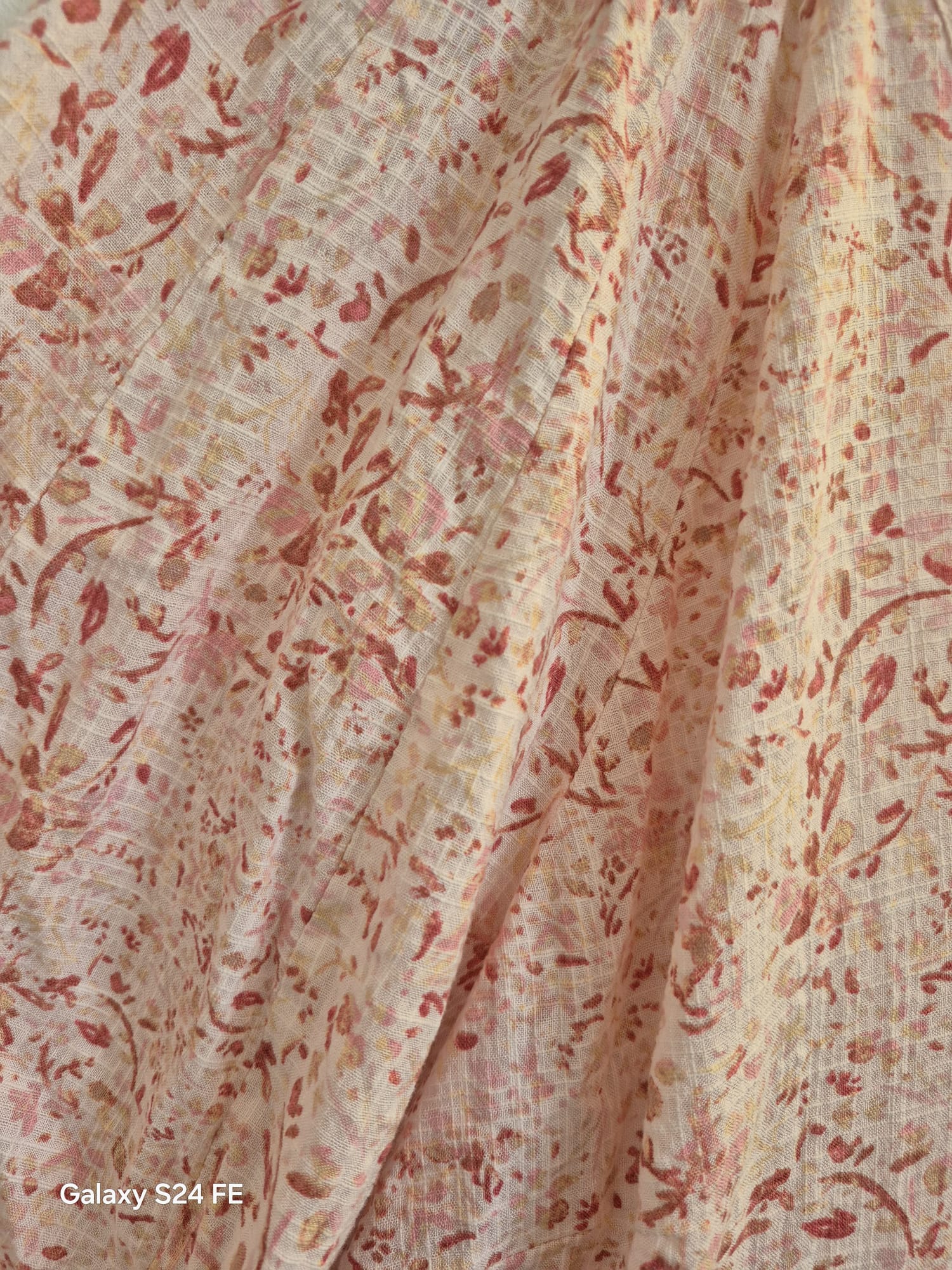 100% כותנה , בד נושם ורך בגווני שמנת עם הדפס פרחים ורודים עדינים.